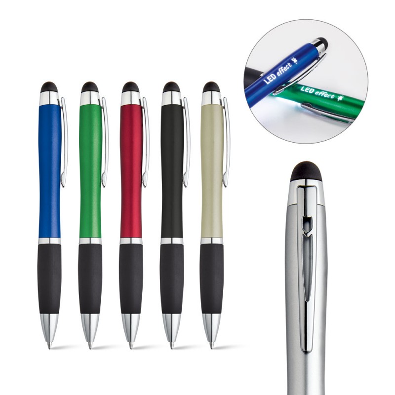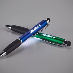 Kuulakärkikynä kosketusnäyttöpäällä ja jossa on kirkas valkoinen ledvalo sisällä. Metallirunko,-klipsi ja -kärki sekä luistamaton oteosa. Sisältää 3 AG3-paristoa. ø11 x 135 mm. Anna logosi loistaa pimeälläkin. Sininen muste. Laserkaiverrusta suositellaan jotta logo saadaan led valaistua. Valo menee päälle kun painetaan kosketusnäyttöpäätä.