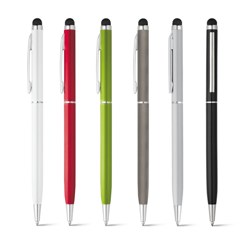 Alumiininen kuulakärkikynä kosketusnäyttökärjellä. ø8 x 135 mm. Sininen muste.