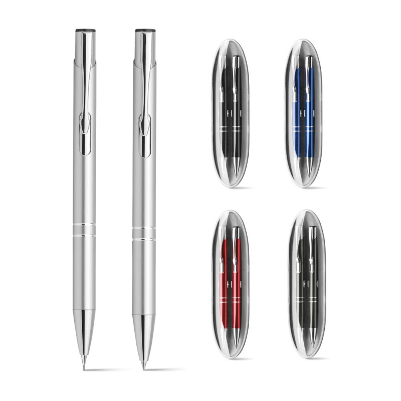 Metallinen kuulakärkikynä sinisellä musteella ja 0.7 lyijytäytekynä lahjalaatikossa. ø10 x 138 mm | Laatikko: 174 x 22 x 46 mm