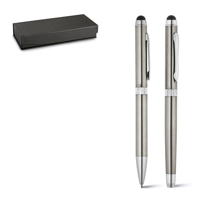 Elegantti metallinen kuulakärkikynä- ja kuulamustekynäsetti kosketuskärjellä. Toimitetaan pehmustetussa lahjalaatikossa. ø10 x 145 mm | Laatikko: 170 x 70 x 30 mm. Musta muste.