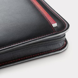 A4-kokoinen PU-nahkainen kansio etutaskulla ja vetoketjulla. Sisältää 20-sivuisen viivoitetun muistilehtiön ja 8-lukuisen kaksitehoisen laskimen LR1130-paristolla (sisältyy). 250 x 345 x 20 mm