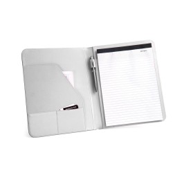 A4 kansio pu-nahkaa ja 800D, sisäpuoli mikrokuitua. Sisältää kuminauhan sulkemista varten, lehtiön 20 viivoitetulla sivulla, 3 taskua ja kynätelineen (kynä ei sisälly). 245 x 315 x 15 mm