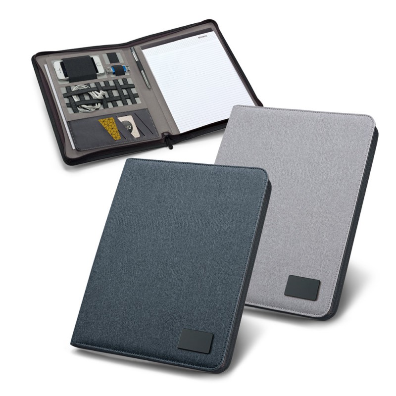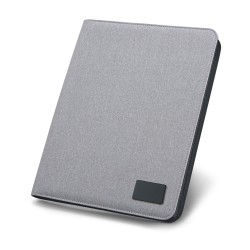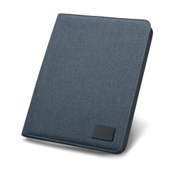 A4 kansio imitaatiopellavaa ja pu-nahkaa. Yksilöitävä metallilaatta kumisella viimeistelyllä, muistilehtiö (20 viivoitettua arkkia), kynäteline (kynä ei sisälly) ja osioita tarvikkeille (eivät sisälly). 259 x 336 x 27 mm | Laatta: 50 x 30 mm