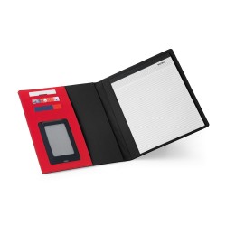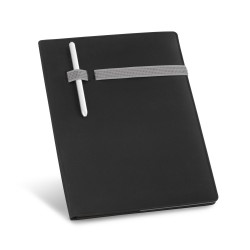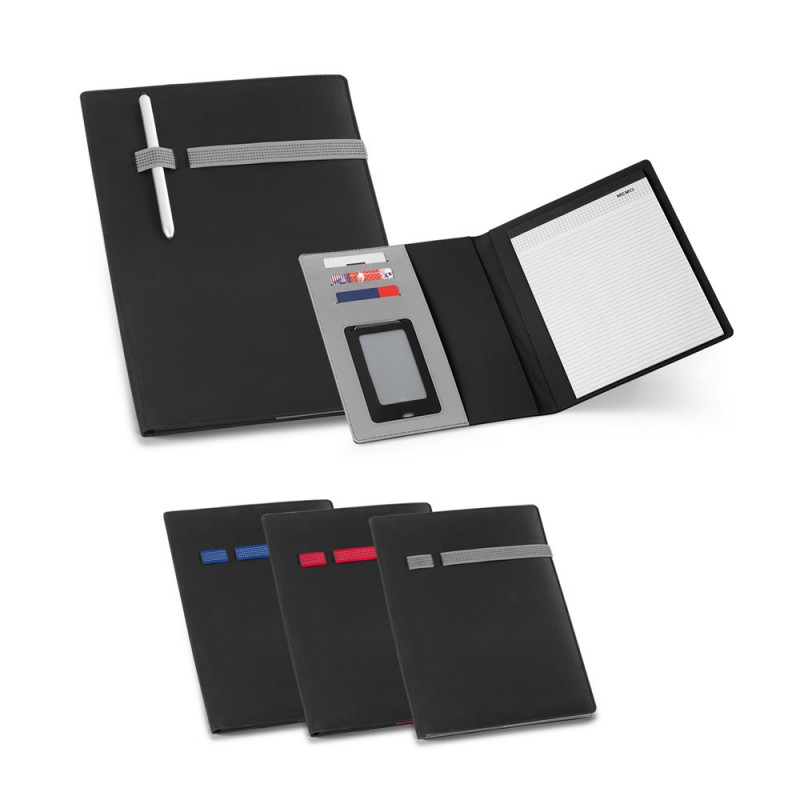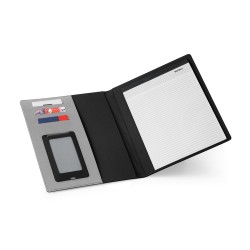 A4 kansio mikroikuitua ja 210D. Sisältää muistilehtiön 20 viivoitetulla arkilla, korttitaskut, puhelintaskun ja kynäpidikkeen (kynä ei sisälly). 240 x 315 x 15 mm