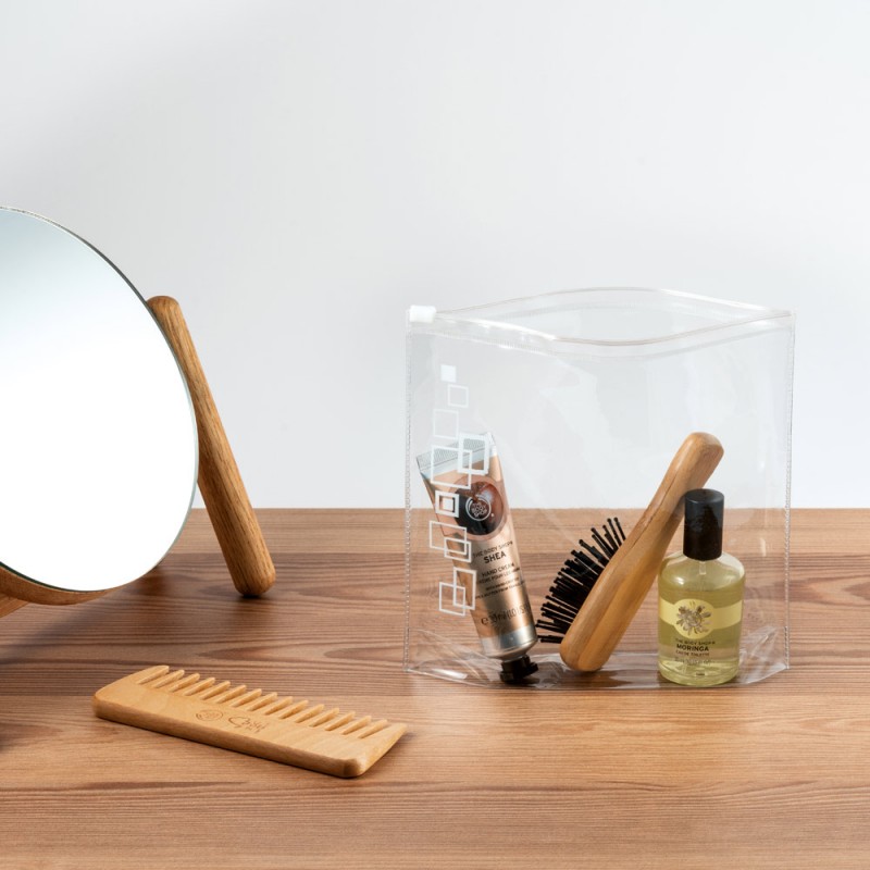 Ilmatiivis PVC kosmetiikkalaukku. Ihanteellinen lentokonematkustamiseen. Pullot eivät sisälly. 165 x 185 x 40 mm | Kapasiteetti < 1 Litraa
