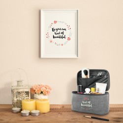 300D korkeatiheyksinen kosmetiikkalaukku pehmustetulla kahvalla ja tuplavetoketjulla. Sisävuori. Sisätasku vetoketjulla. 200 x 115 x 140 mm