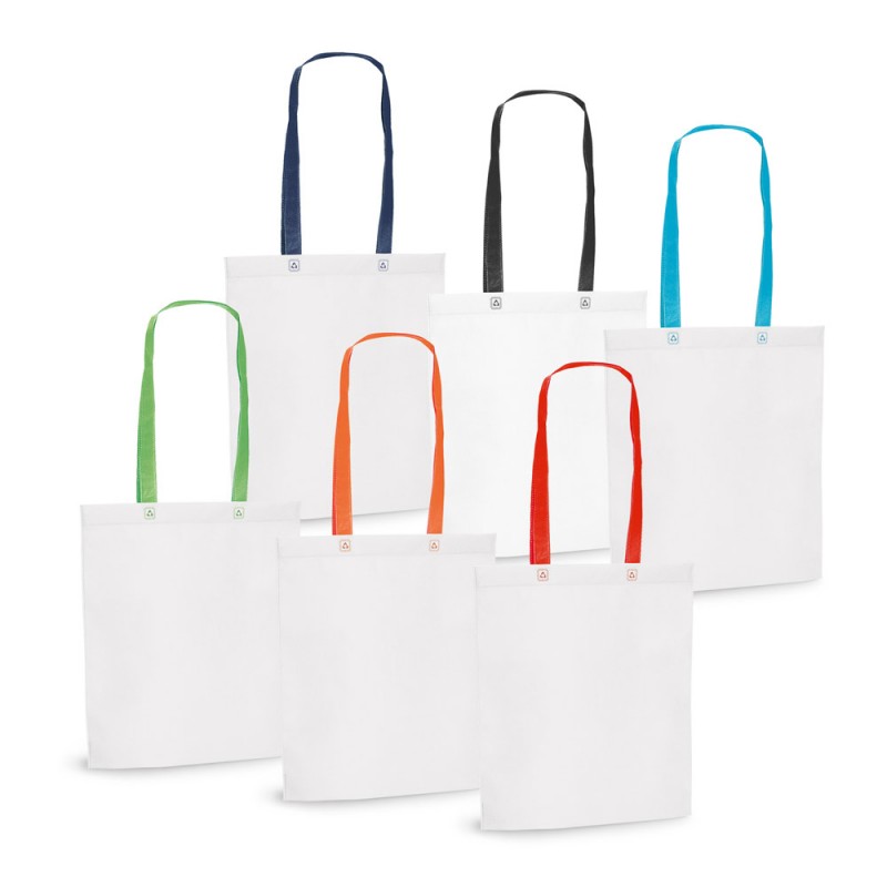 Kuitukankainen (80 g/m²), kuumasaumattu kassi. Sangat 55 cm. Kierrätysmerkein. 330 x 390 x 80 mm.