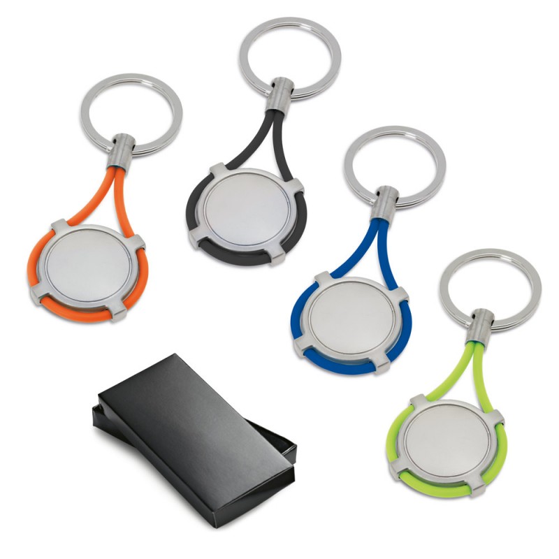 Pyöreä avaimenperä metallia ja silikonia. Tämä yksilöitävä avaimenperä toimitetaan lahjalaatikossa. 36 x 66 x 5 mm