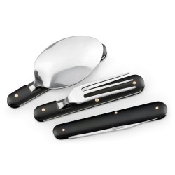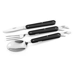 Kolmen aterimen setti: lusikka, veitsi ja haarukka ruostumatonta terästä. Toimitetaan 600D pussissa. Taiteltuna: 92 mm | Auki: 165 mm | Pussi: 80 x 110 mm
