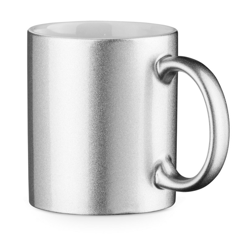 Satiininhopea Keraaminen muki. Tilavuus 370 ml. Sopii erinomaisesti myös sublimaatio-painatukseen. ø83 x 97 mm