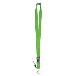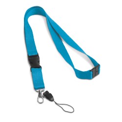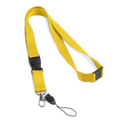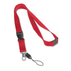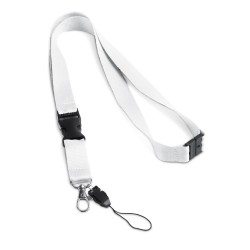 Kaulanauha polyesteriä metallikarabiinikoukulla, irroitettavalla avaimenperällä, puhelinlenkillä ja turvalukolla. 20 x 510 mm